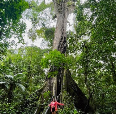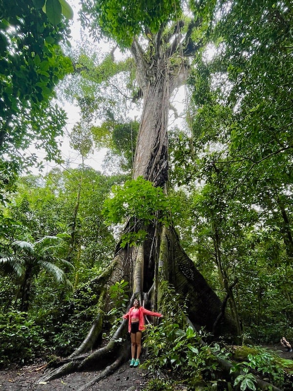 Und nicht dieser besondere Ausblick macht die Wanderung lohnenswert, nein, es ist das gesamte Erlebnis. Die Wege führen in Form von Trampelpfaden durch den Urwald. Wir haben das Glück, dass wir, vermutlich auch wetterbedingt, nicht auf viele Leute treffen, und dadurch die meiste Zeit das Gefühl haben, alleine im Regenwald zu sein. Es wird ein einmaliges Erlebnis, als es anfängt zu regnen. Regen im Regenwald ist etwas ganz besonderes. Die Geräusche, der Geruch – es ist einzigartig. Ein weiteres Highlight dieser Wanderung ist der 400 Jahre alte Ceibo-Baum, dessen Stamm einen unbeschreiblichen Durchmesser hat und 30 Meter in die Höhe misst. Der Baum ist so riesig, dass man sich ziemlich anstrengen muss, um ihn in seiner Ganzheit auf ein Foto zu bekommen.