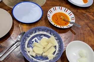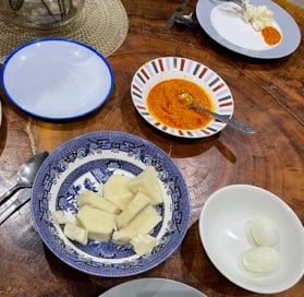 Ein traditionelles ghanaisches Gericht, das normalerweise noch mit Sardinen gegessen wird: Yam mit einer Soße aus pürierten Tomaten, Zwiebeln, „Red Oil“ und afrikanischer Aubergine