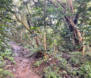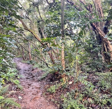 Der erste Teil des Trails ist ein breiterer Trampelpfad, der sich durch den Regenwald hindurchschlängelt. Schnell macht sich die hohe Luftfeuchtigkeit bemerkbar. Hier sollte man auch auf Matsch vorbereitet sein, der je nach Wetterlage dazu führt, dass es relativ rutschig ist. Der Weg zum ersten Peak ist der längste und es geht innerhalb der ersten Stunde weiter durch den Wald, während man immer höher Richtung Grat kommt. Nach einem kurzen Abschnitt durch Nadelbäume wird die Steigung noch etwas steiler. Schon zu diesem Zeitpunkt ergeben sich immer wieder wunderschöne Ausblicke durch die Bäume hindurch. Bald trifft man auf die ersten Stellen, wo man mit Hilfe von Seilen einige Meter nach oben klettern muss.