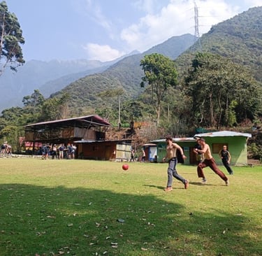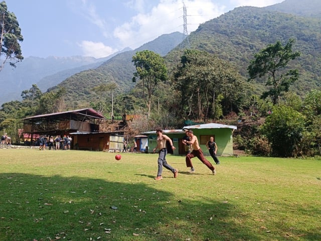 Während der nicht so kurzen Fußball-Einheit habe ich das erste Mal so richtig die Moskitos bemerkt. Während Moskitos an den ersten beiden Tagen gar kein Problem waren – wir waren ja auch fast 2000 Meter höher –, habe ich mich heute das erste Mal so richtig mit Moskito-Spray eingesprüht. Ich habe im Vorfeld gehört, wie übel man wohl auf den letzten beiden Salkantay-Tagen zerstochen werden würde, und habe deshalb auch meine langen Hosen angelassen. Die Temperaturen würden es seit heute definitiv zulassen, in Shorts zu wandern. Aber das war mir zu riskant.