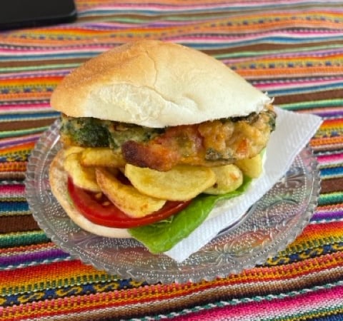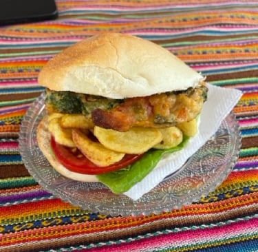 Heute war es definitiv gut und wichtig, dass einige von uns eine GPS-Karte des Trails heruntergeladen hatten – während an den ersten beiden Tagen eigentlich wenig schiefgehen konnte und der Wanderweg schwer zu verfehlen war, gab es heute dann doch einige Wegkreuzungen. Nach einiger Zeit wanderten wir schließlich im Tal direkt am Fluss entlang, den wir den ganzen Tag schon von oberhalb sehen konnten. Als wir, vermutlich etwa drei oder vier Kilometer von unserem Hostel entfernt, einen kleinen Stand am Straßenrand sahen, der mit „hamburguesas“ warb, konnten wir nicht widerstehen – zumindest ein Teil der Gruppe nicht. Somit haben wir uns kurz vor Schluss doch noch aufgeteilt. Während die Hälfte von uns weiterlief, haben wir anderen unsere Hamburger für 6 Soles (1,50 €) mehr als genossen. Nur die vielen Fliegen und Moskitos am Tisch haben etwas genervt. Während der Wartezeit haben wir mit dem kleinen Sohn der Besitzerin gescherzt und beobachtet, wie nach und nach die Kinder in ihren Uniformen von der Schule zurückgekommen sind.